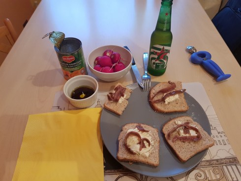 Sono mesi ormai che sto passando un periodo lavorativo di melma, non è facile trovare la voglia di prepararsi una cenetta come si deve, così ricasco nei miei vecchi difetti, mi adeguo al bluesy mood, riscaldo fette di pane sulla padella, un goccio d’olio, vi spalmo sopra formaggini Mio e aggiungo qualche acciuga, quindi pinzimonio per rapanelli (sì, va beh, ravanelli), una birra e una lattina aperta di frutta sciroppata. Più blues di così !? Eric nel frattempo ci dà di reggae.