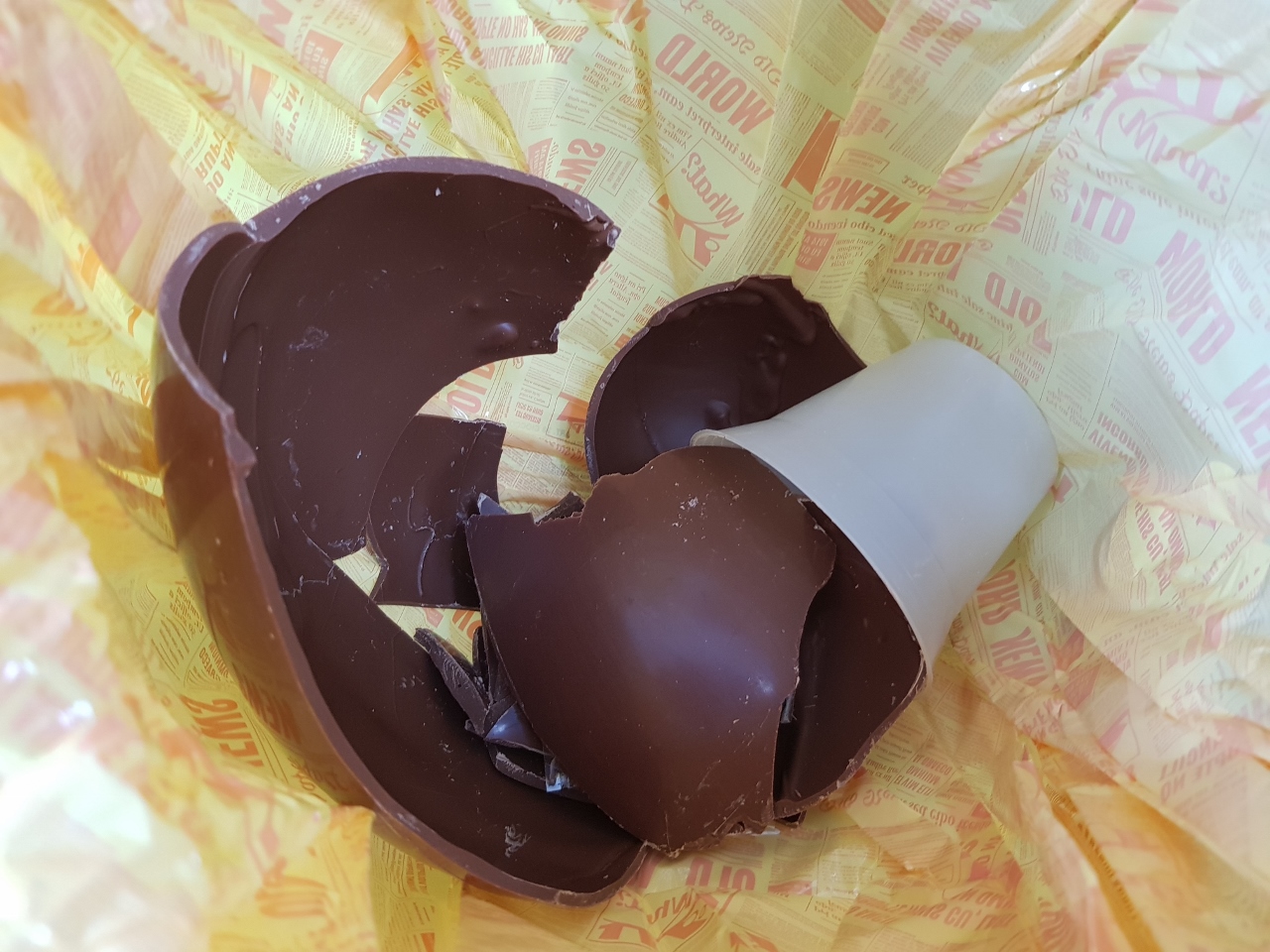 Polly sconsolata apre la confezione per trovarci dentro un ammasso di rottami di cioccolato.