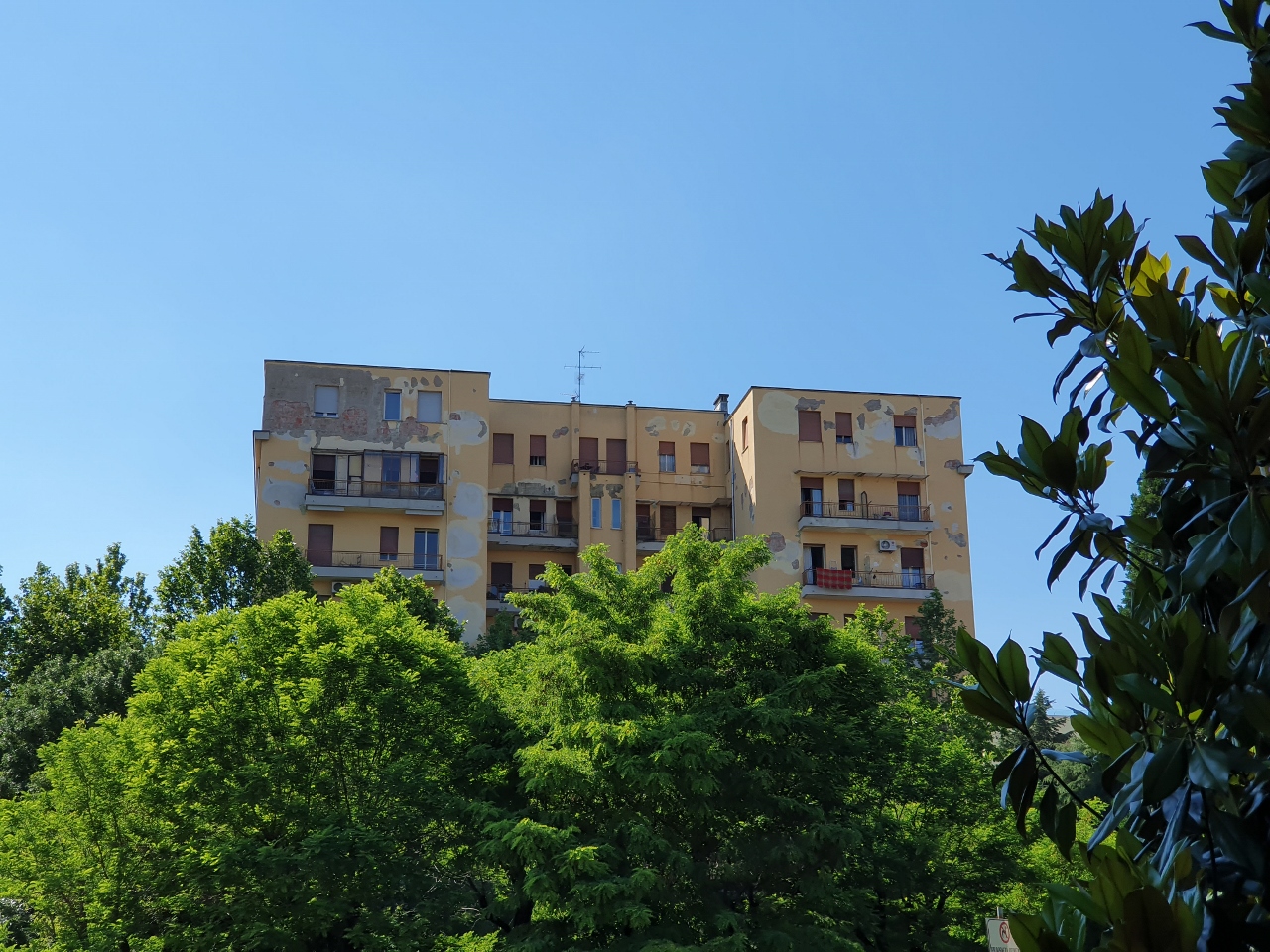 In giro per lavoro per Mutina. Cammino e penso, tra me e me, come sempre. Penso troppo, vorrei distrarmi ma non riesco, sono condannato a cogliere il lato blues delle cose, anche di quel vecchio palazzo e che vedo alla mia sinistra, palazzo che si erge tra gli alberi. L’intonaco che cade a pezzi e che si staglia nel blu chiaro del cielo.
