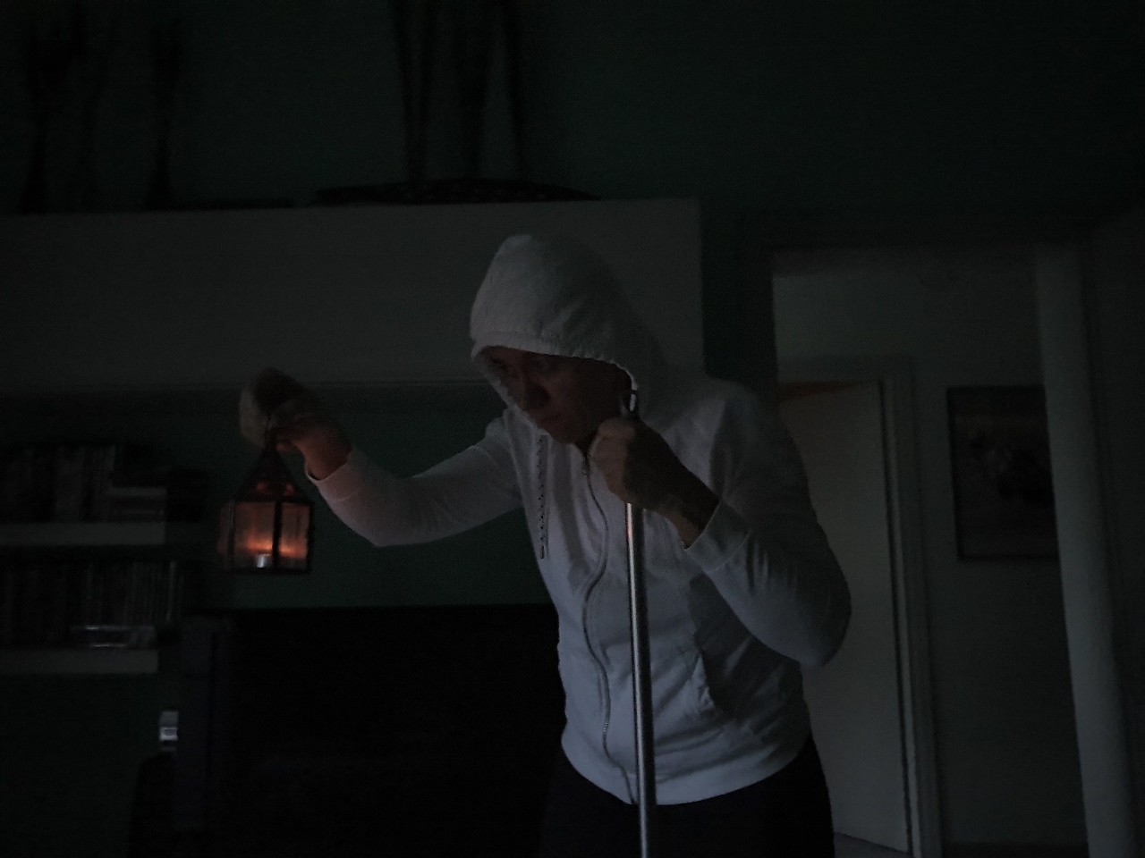 Il blues comunque continua, la pollastrella cerca di sollevarmi il morale entrando in sala camuffata da Eremita; rido nel vederla riprodurre la copertina interna di LZ IV.