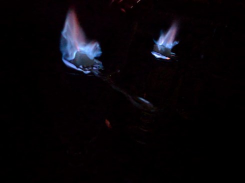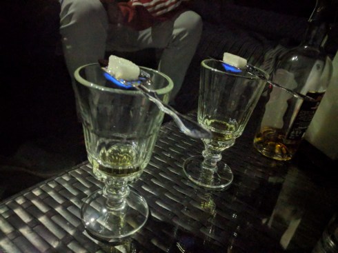 Entrambi dediti all’esoterismo zeppeliniano e del sud degli stati uniti ci facciamo preparare l’Assenzio dalla pollastrella nel modo tradizionale. Zollette di zucchero flambé, cucchiai e bicchieri ad hoc provenienti dalla folclore di Nouvelle Orleans