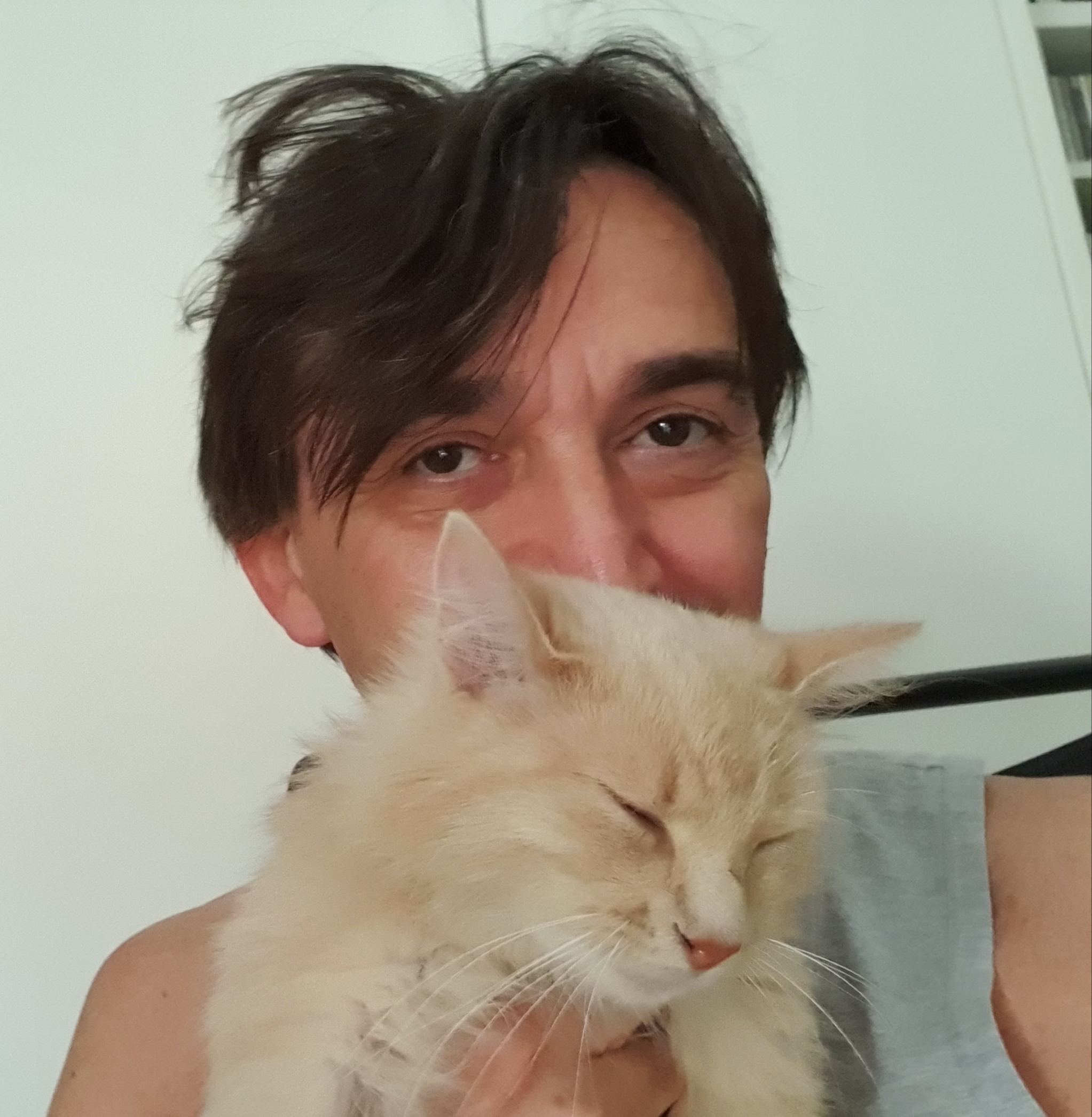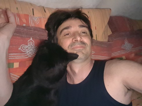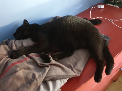 La pollastrella è a Londra con una nostra amica per vedere l’ennesimo concerto di Rick Wakeman (e ti pareva), io sono a casa solo con i gatti. Palmir e ancor più affettuoso del solito, sente la mancanza della sua umana e si appoggia a me. Nonostante il caldo, all’ora di andare a dormire, mi si sdraia di fianco e per tutta la notte non perde il contatto col suo umano di riserva.