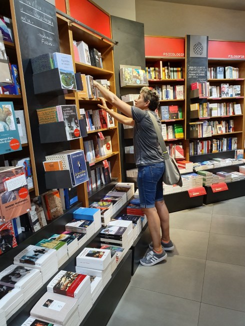 Esco dal Coop, mi squilla il cellulino, rispondo. Dopo trenta secondi riaggancio, mi guardo intorno e non trovo Polly. Mi affaccio davanti alla libreria (esterna) della Coop e la vedo arrampicata sugli scaffali a cercare chissà quale edizione di chissà quale titolo. Riesco a fotografarla solo quando è ormai scesa. Ora, sono molto felice che la mia pollastrella sia una accanita lettrice, ma come ho già scritto sul suo comodino, in camera da letto, c’è già una pila di libri alta come la torre Eiffel, non vorrei che una bella notte crollasse e bye bye uomo di di blues…