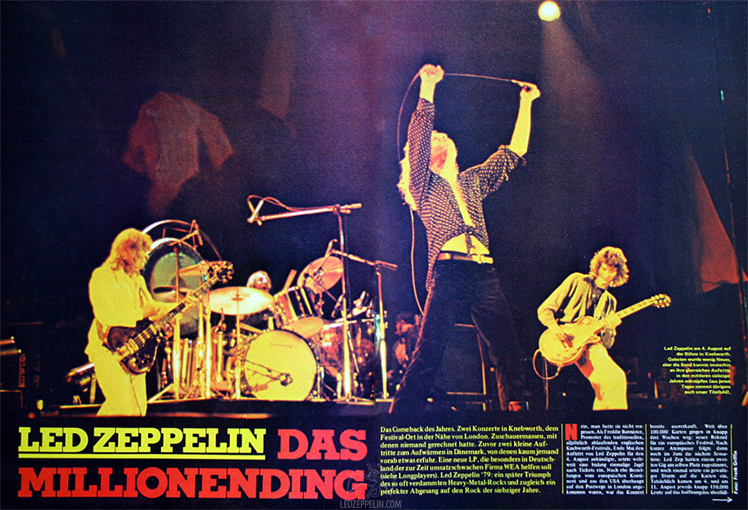 Qualche giorno prima dell’uscita dell’album i Led Zeppelin suonarono due date al festival di Knebworth, il 4 e l’11 agosto. Fu il ritorno ufficiale del gruppo dopo due anni di fermo dovuto alla morte del figlio di Robert Plant. Per anni si è parlato di 210.000 spettatori la prima serata e 110.000 la seconda, ma in realtà furono poco più di 100.000 la prima e poco oltre i 40.000 la seconda. Tutto sommato niente male per un gruppo fermo da due anni e che ritorna in un momento – musicalmente parlando – ad esso assai poco favorevole. Non erano più i Led Zeppelin dell’immaginario collettivo, il chitarrista faceva regolarmente uso di pesanti sostanze stupefacenti e le sue performance non erano certo più le stesse. Meglio dei concerti di Knebworth furono le due date warm up a Copenhagen il 23 e il 24 luglio 1979 …
