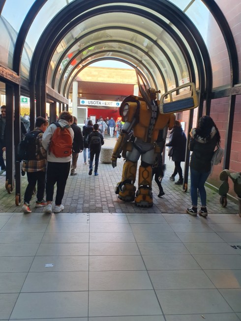 Sinceramente però non sappiamo chi stia peggio, noi che compriamo gli stessi dischi di 45 anni fa o quelli che nel padiglione dell’Elettronica sono intorno al banchetto del tipo che vende vecchi manuali Windows, Dos e simili. Inoltre ci sembra che la faccenda Cosplay sia sfuggita di mano. Finché sono i giovanissimi anche anche (magari anche io a 13 anni avrei voluto vestirmi da Sandokan o da Jack London) ma qui ci sono anche uomini e donne ben oltre i 30 e i 40 versione cosplay. Mi prometto di non fare foto (tutti vogliono essere fotografati) ma poi ne scatto due cercando di non farmi vedere da nessuno. Gente vestita da Predator, da Rocky Balboa, da La Casa De Papel, da Sherlok Holmes, addirittura uno da Transformer (almeno credo) accompagnato da moglie e figlia.