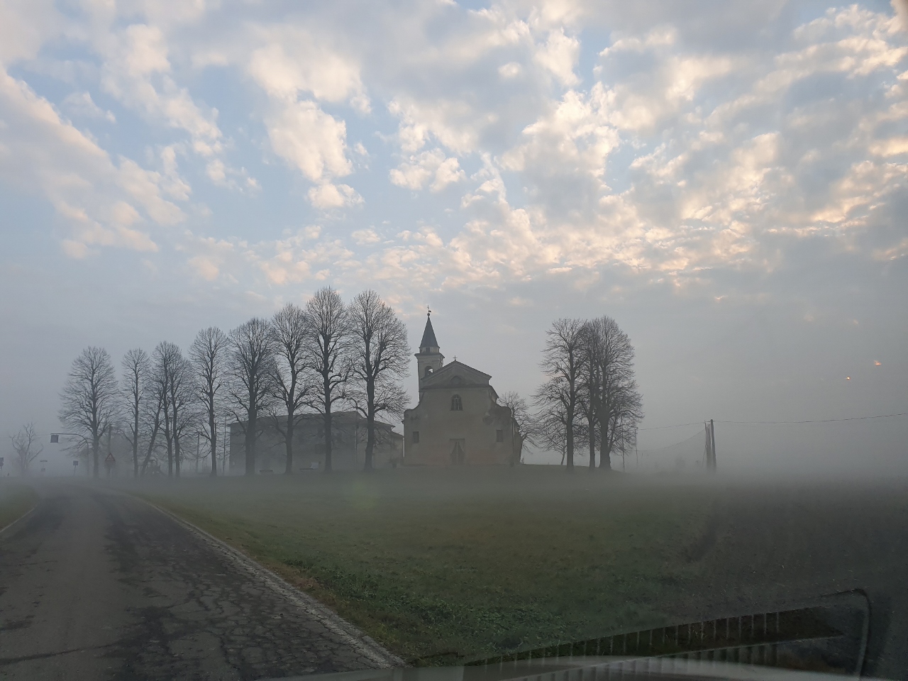 Mattina di gennaio, sulla Sigismonda percorro le blue highway (le strade basse insomma) diretto al lavoro. C’è foschia, freddo e una trapunta di nubi che copre il cielo. Sullo sfondo osservo la chiesetta di Prato, piccola frazione di Corrigium. Mi fermo a fotografarla. Trattando un po’ questo scatto con filtri particolari potrebbe diventare la copertina di un disco dei Black Sabbath, secondo me.