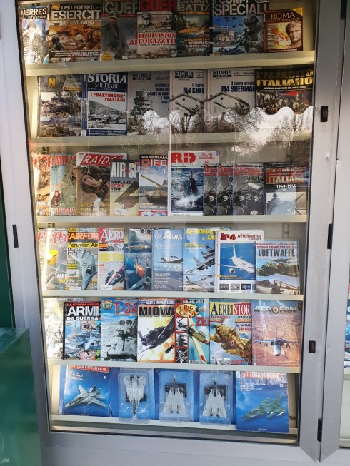 Ieri, sabato, diretto alla Coop per la spesa settimanale con la pollastrella, mi fermo in quella che sta diventando la mia edicola di riferimento di Regium Lepidi. Compriamo i soliti tre quattro etti di fumetti, un paio di quotidiani e facciamo due chiacchiere con l’edicolante circa i prodotti che ha in vendita e che sono prodotti dalla azienda per cui lavoro oggi. Usciamo, do un’occhiata alle vetrate dell’edicola e noto che sono piene di riviste che parlano di aeronautica. Ma c’è davvero un pubblico per quel tipo di riviste? Ci sono realmente appassionati che si interessano di quelle cose? Evidentemente sì, è solo che io sono così preso dai miei interessi che quelli degli altri mi sembrano alieni. Povero me.