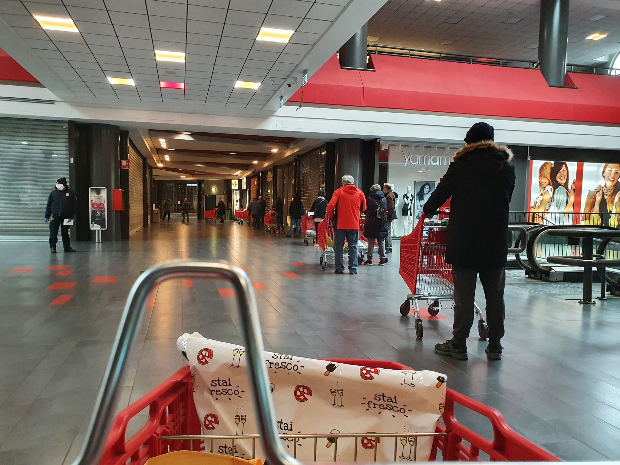 Nessuna macchina in giro per le stradine di campagna, qualche veicolo per le strade della città, poca gente al centro commerciale. Il parcheggio al coperto poco illuminato, a parte il supermercato tutti gli altri negozi chiusi, gli avventori in fila distanziati un paio di metri gli uni dagli altri per entrare (5 alla volta). Atmosfera da The Walking Dead. E chi l’avrebbe detto che si sarebbe vissuto un periodo come questo?