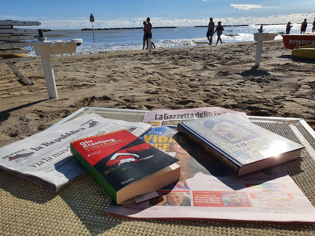 sotto l’ombrellone la Gazza, La Repubblica (che avevo detto non avrei più letto da quando è finita in mano agli oligarchi piemontesi ma tant’è …), Il Vagabondo Delle Stelle di Jack London (Saura), il quinto capitolo delle inchieste dell’Ispettore Capo Chen di Qiu Xiaolong (per me) e una nuova edizione di Sandokan di Salgari preso in edicola.