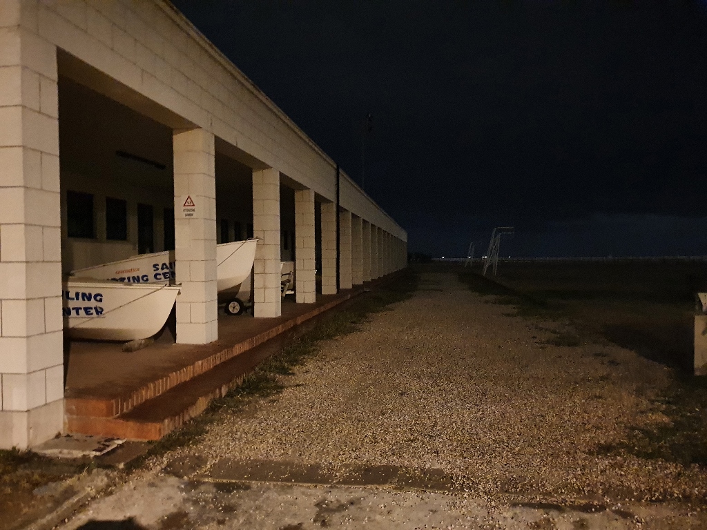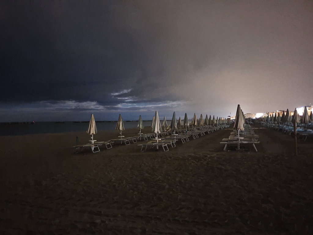 Ci fermiamo un momento sulla spiaggia avvolta dalle tenebre, Cesenatico appare lontana,