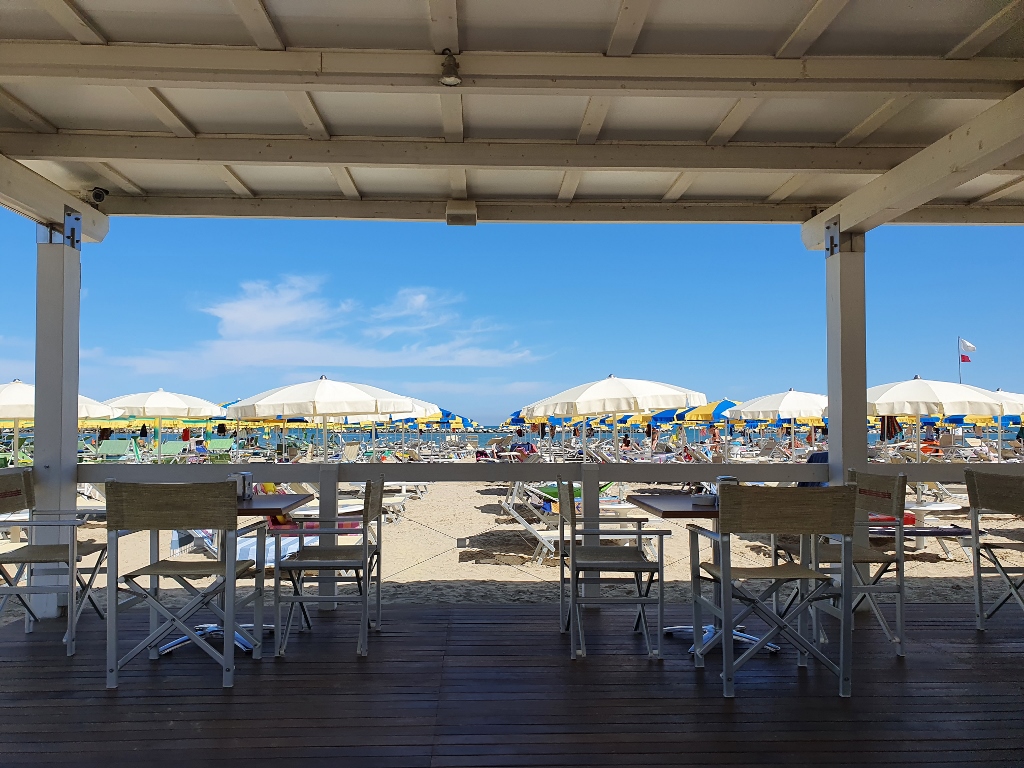 Primo bagno, doccia, un po’ di sole e quindi sulla veranda del ristorantino del bagno Maeba per un pranzetto veloce. Ecco, quello è uno dei posti simbolo per me: la veranda del Bagno Maeba. Dopo un bel bagno, nell’ora in cui quasi tutti tornano in hotel noi rimaniamo in spiaggia a goderci quelle tre/quattro ore di pace quasi assoluta, di reminiscenze del mio passato vacanziero ai Lidi ferraresi, di meditazione blues.