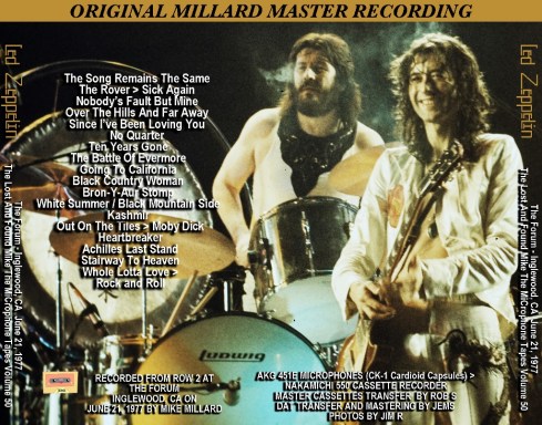 Tra tutti i concerti registrati dal grande Mike Millard, questo è di sicuro quello più famoso, la prima data dei sei concerti tenuti al Forum di L.A. dai LZ bel 1977. Di questo show sono stati stampati decine di bootleg e fatte innumerevoli versioni rimasterizzate, questa dovrebbe essere la migliore dal punto di vista qualitativo dato che proviene direttamente dal master di Millard. Nella piccola parte mancante di Ten Years Gone – dovuta al cambio cassetta al momento della registrazione – il team JEM ha usato parte della registrazioni fatta al tempo da un altro fan, un certo GaryB. Millard registrò quattro delle sei date dei LZ al Forum, questa – insieme a quella del 23 – cattura il gruppo nel momento migliore del tour del 1977, tour come sappiamo di enorme (!) successo ma corrotto dallo stato del chitarrista e del management, tutti sotto la forte influenza di sostanze chimiche. Anche Bonham lo era, ma le sue performance fortunatamente non ne risentirono, solo una volta suonò male, successe a San Diego, il 19 giugno 1977; il batterista ebbe problemi di stomaco dovuti ad una intossicazione alimentare che minò la sua esibizione ma una volta ristabilitosi decise di riprendersi la scena alla prima occasione, ovvero al concerto successivo che guarda caso è quello di cui parliamo oggi.