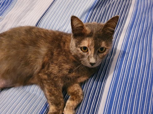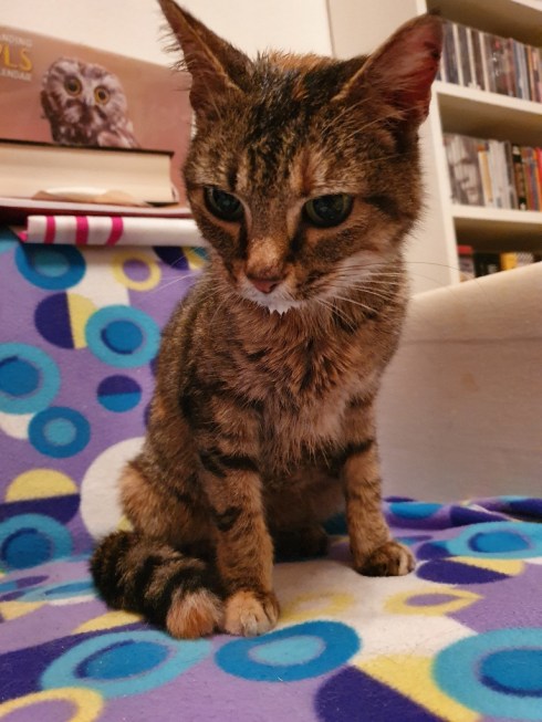 Ci mancava solo il blues della separazione da una gatta. Martedì scorso verso sera troviamo nella cuccia che abbiamo sulla balconata (la cui scala da sul cortile) una gattina presumibilmente giovane e molto malmessa e denutrita; è spaurita, confusa, magrissima, sofferente nell’animo. La accogliamo in casa, è grande più o meno come la Minnie ma pesa meno della metà, la bilancia si ferma a 2,1 kg.