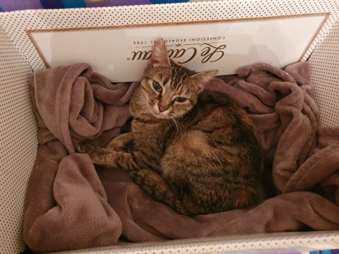 Parto per il lavoro, le accarezzo la testolina, mi guarda con adorazione. Già la sento mia. Ma poi a metà mattina mi scrive Saura: una sua parente ha appena perso una gattina e sarebbe molto interessata. Che ne penso, mi chiede … Sono d’accordo ad affidarla ad altri? Naturalmente sì, nella nostra vita insieme – vivendo in campagna – io e la pollastrella abbiamo già accolto diversi gatti e al momento ne abbiamo sei nostri e altri due randagi che si sono accasati da noi, e poi siamo certi che andrà a star bene, la parente di Saura è una amante di felini.