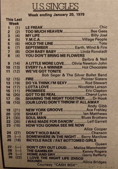 Con lo sguardo come sempre fisso sullo specchietto retrovisore, contemplo la classifica USA dei singoli di 41 anni fa. Le Freak, My Life, Hold The Line, We’Ve Got Tonite, Lotta Love, New York Groove, Fat Bottomed Girls … felice di essere cresciuto con canzonette di quel tipo.