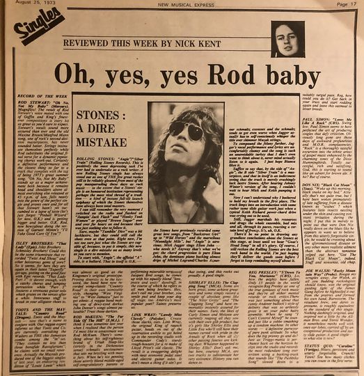 Rispunta un trafiletto dal passato tratto da una pagina del 1973 del New Musical Express, rivista britannica, relativo alla recensione molto tranchant di quello che allora era il nuovo singolo dei Rolling Stones. Mi stupisco della cazzimma di Nick Kent e mi dico che era bello quando i giornalisti osavano e non avevano paura di “ritorsioni” da parte dei gruppi.