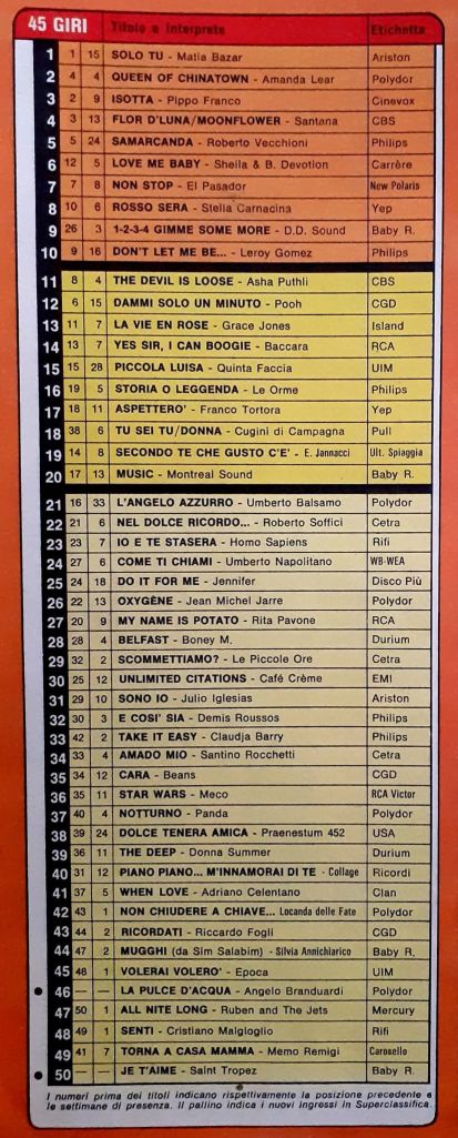 Incappo in un trafiletto tratto da una vecchia rivista nazional popolare italiana, Sorrisi e Canzoni Tv, riporta la classifica dei 45 giri più venduti nel gennaio del 1978 in Italia. Ripenso al Tim adolescente di quel periodo che si attaccava ai nomi a lui cari presenti in classifica … Santana, Vecchioni, Le Orme, Pooh, Jean Michel Jarre, Locanda Delle Fate, Branduardi…