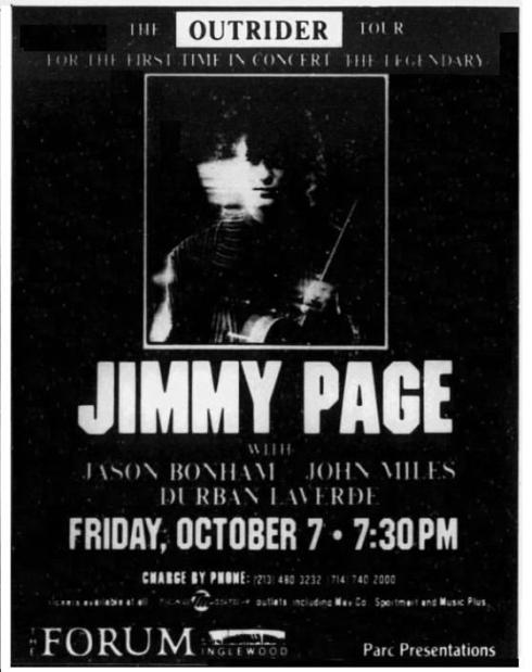 “Ah, l’Outrider tour, l’ultima volta in cui Page è stato Page; pur non essendo stato un avvenimento memorabile nella storia della musica Rock, per i LZ fan rimane un caposaldo nella storia di Jimmy Page chitarrista Rock. La band non era un granché: Jason Bonham alla batteria (all’epoca ancora immaturo e sopra le righe) e un oscuro session man di Capo Verde al basso (tal Durban Laverde) non permisero a Page di raggiungere gli spazi siderali, i viaggi cosmici a cui aveva abituato con i LZ; persino il grandissimo JOHN MILES era stato istruito ad essere una copia di Plant e scrivere cose trite e ritrite per compiacere MTV … tuttavia con un Page finalmente in ottima forma, i mesi di ottobre e novembre di quel OUTRIDER tour del 1988 furono entusiasmanti… un musicista finalmente di nuovo col completo controllo del suo strumento … “
