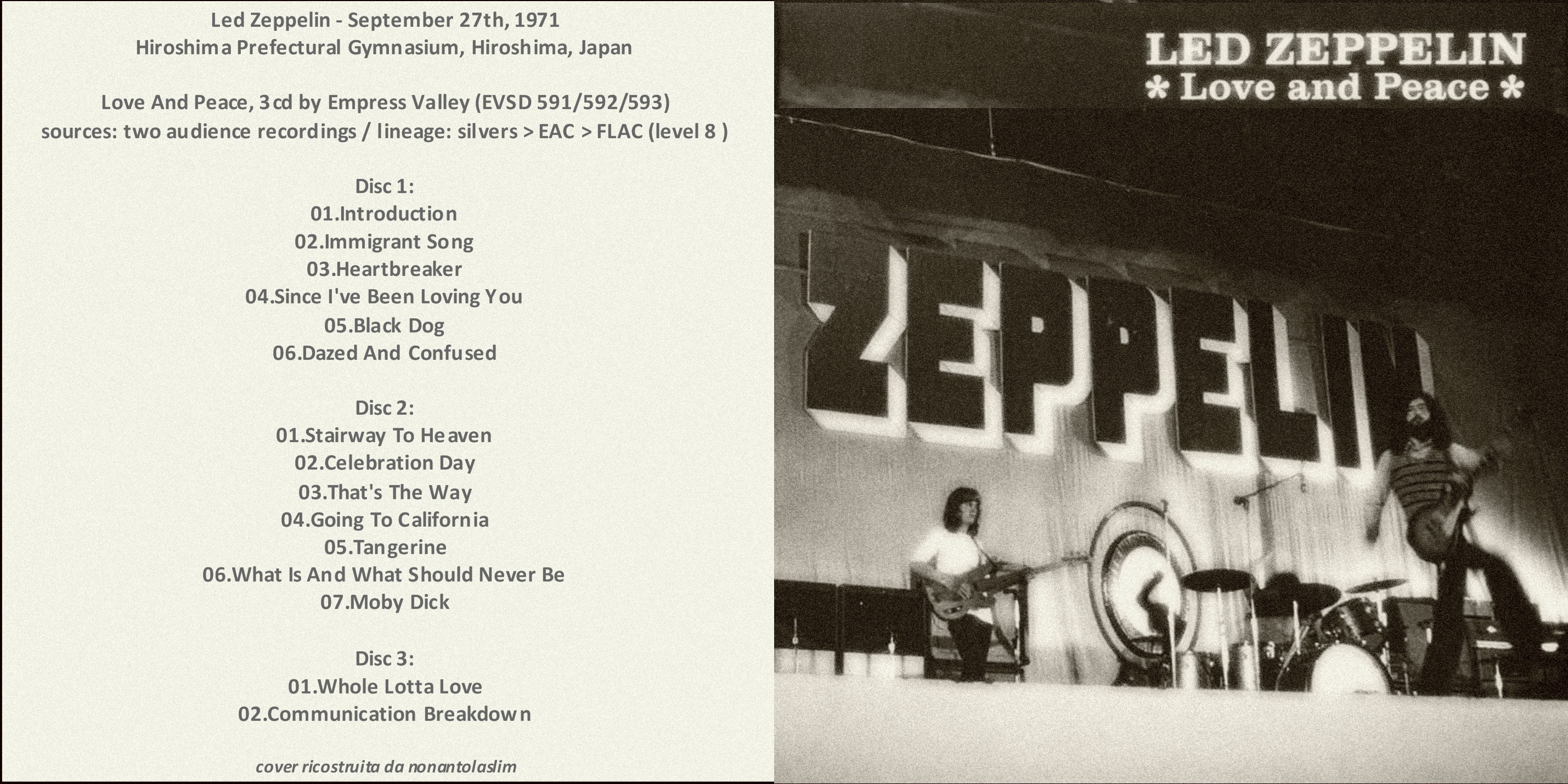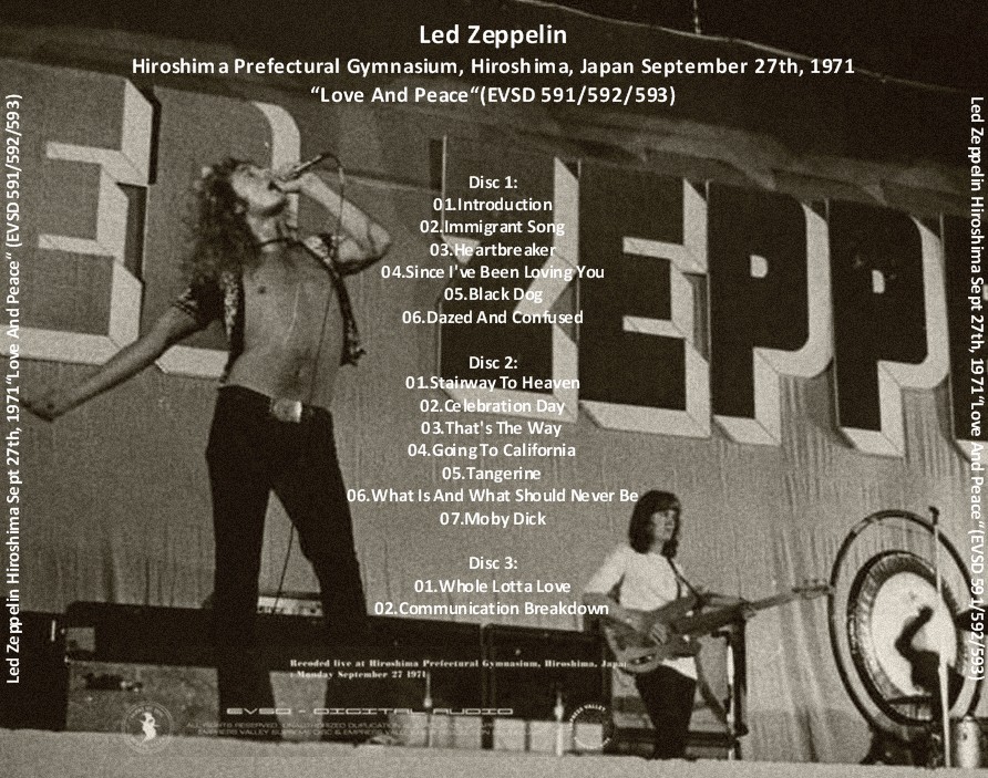 Nuova versione di questo bootleg audience, stavolta però trattasi di upgrade notevole, a cura della EMPRESS VALLEY SUPREME DISCS. La versione che avevo fino ad oggi era quella intitolata ZINGI della TARANTURA, beh non c’è paragone. In questa il sibilo che contraddistingueva le precedenti edizioni è pressoché inesistente, e il sound è davvero migliorato di almeno un mezzo punto, se non di più. Resta comunque una fonte audience non proprio godibilissima, indigesta per il casual fan, ma comunque affrontabile da un qualunque zep fan che si rispetti. Il tour giapponese del 1971 è probabilmente uno dei due zenith dei LZ, ogni data è incredibile per potenza, aggressività, testosterone, gioia di vivere. Le esibizioni sono quanto di meglio il rock in senso stretto ha saputo offrire, basta accostarsi ai primi pezzi del concerto per accorgersi della cosa: l’assolo di HEARTBREAKER di PAGE è così elegantemente selvaggio da lasciare a bocca aperta, RP canta come non ho mai sentito fare nessun altro, e BONHAM…beh, bastano quelle piccole cose che prendono forma ad esempio al minuto 04,36 di SIBLY per farmi godere immensamente.