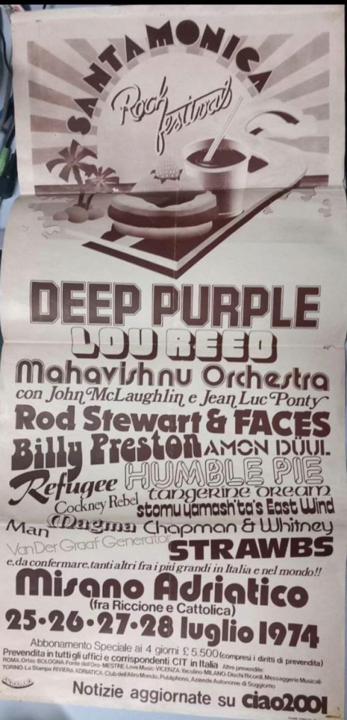 Mi imbatto ancora una volta nel manifesto del Festival Rock previsto a Misano Adriatico nel luglio de 1974 ma mai concretizzatosi. I Deep Purple mark III, Lou Reed, Mahavishnu Orchestra, Billy Preston, i Faces, gli Humble Pie e via via tutti gli altri. Ah!