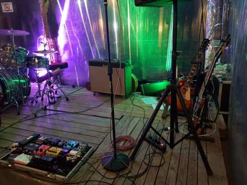 Il soundcheck va via senza grossi intoppi, oltre alla voce amplifichiamo la cassa della batteria. Provo la doppio manico … con la temperatura che ci sarà stasera sarà un problema tenerla accordata.
