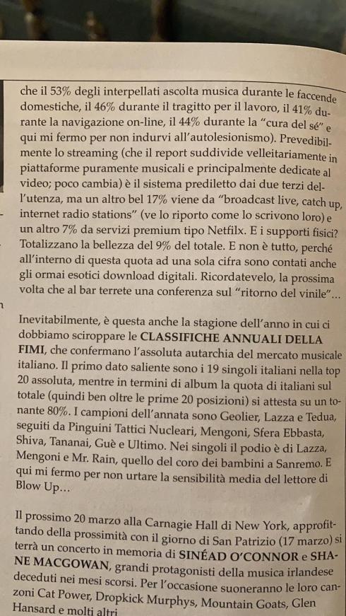 “Non abbiamo più tempo per ascoltare musica brutta o inutile. Non invidio chi fa finta di avere ancora voglia di scoprire quotidianamente soggetti che ricoprirà di aggettivi importanti ed iperboli sprecate per cose che non andranno mai neppure vicino alla Grande Musica che abbiamo vissuto.